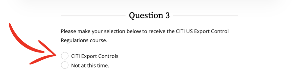 • For Export Controls, select the “CITI Export Controls” course under Question 3. What this looks like.