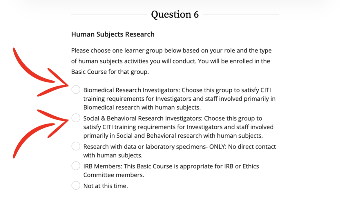 • For Human Subjects Research, select either “Biomedical Research Investigators” or “Social & Behavioral Research Investigators” under Question 6. This fulfills the IRB requirement for the basic/refresher human subjects research training. What this looks like.