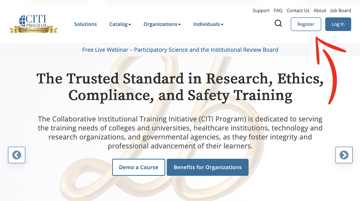 Step 1: Go to the CITI Program website and click “Register” as a first-time user. What this looks like.