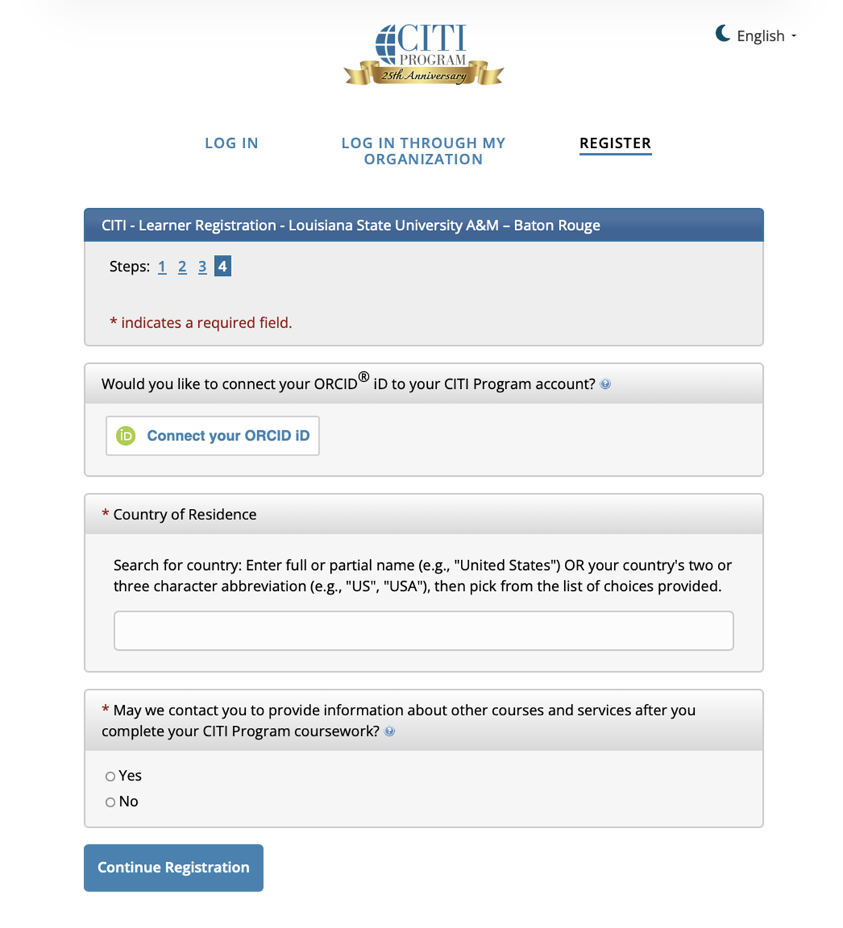 Step 6: Next, choose if you want to connect your ORCID ID, enter your country of residence, and select your contact preferences before clicking “Continue Registration.” What this looks like.