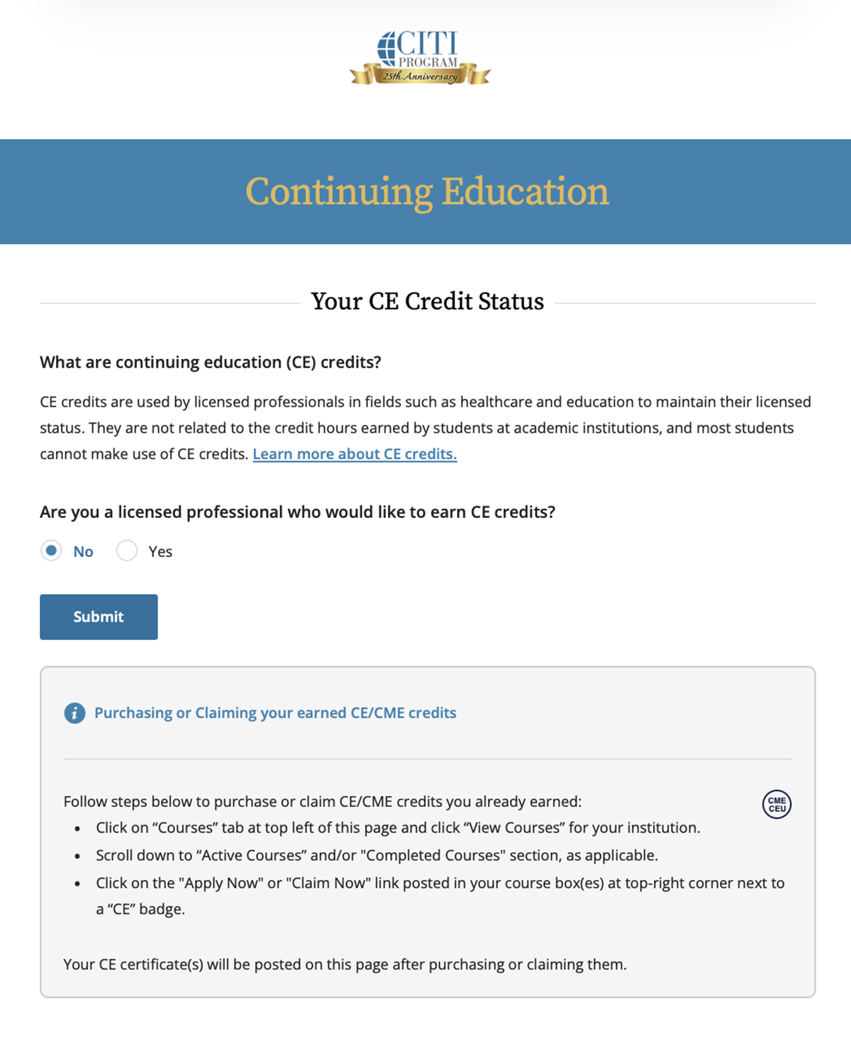 Step 7: Choose whether you would like to earn continuing education (CE) credits and then click “Submit.” (Most users will not select this option.) What this looks like.
